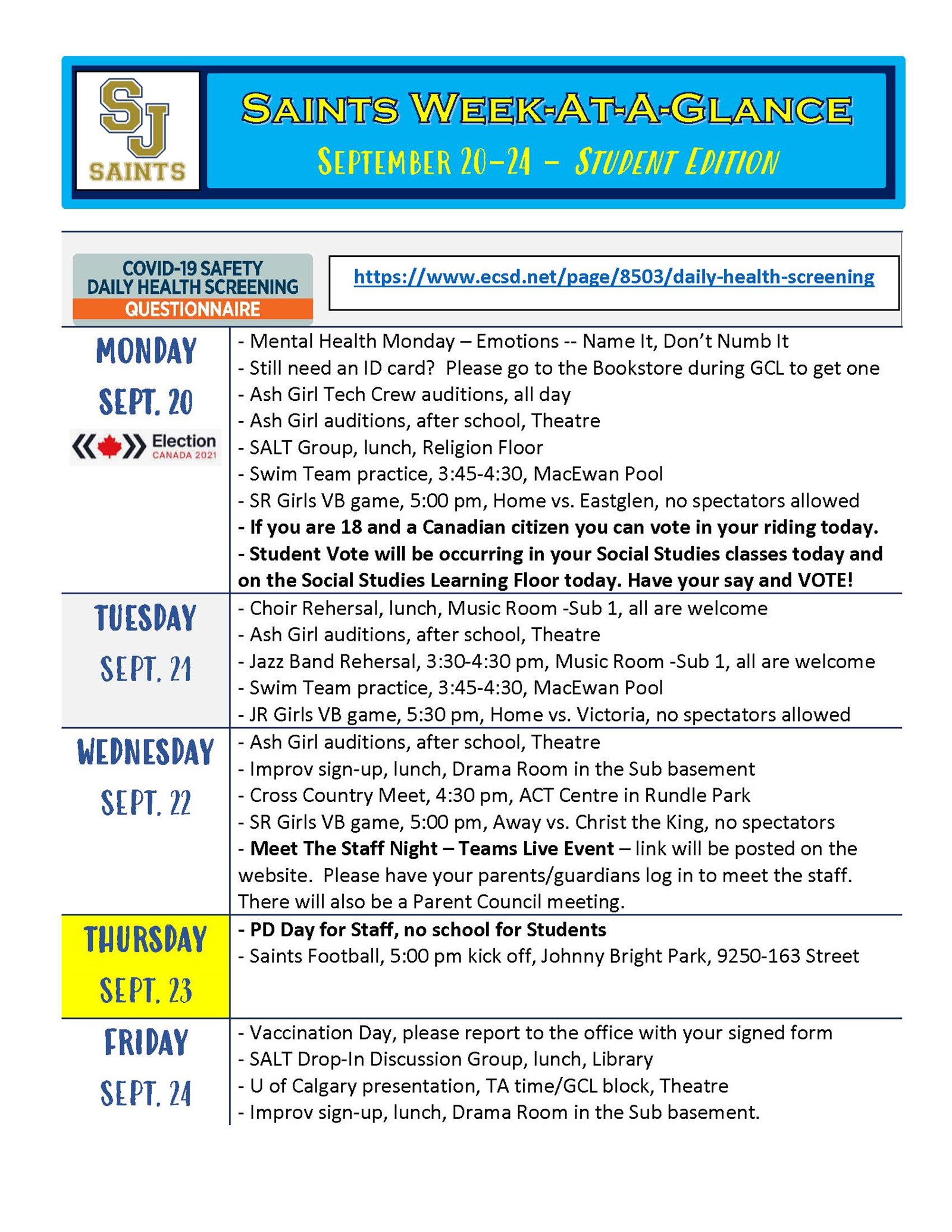 Saints Week At A Glance - Sept 20-24